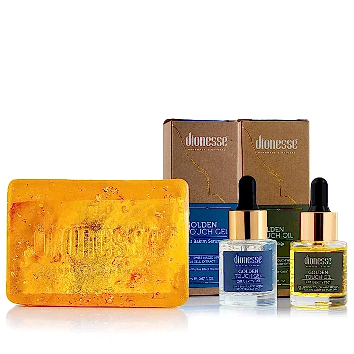 Dionysse Golden Touch Soap is 100% handmade. Equal amounts of 24 carat gold particles are sprinkled by hand and the gold leaf is carefully placed in the middle of our soap mold. Its dense creamy foam gently cleanses your skin. The 24 carat gold in the soap quickly transmits the effects of stem cells and valuable complexes to your skin. It brightens your skin, significantly improves wrinkles and fine lines. It has a tightening and moisturizing effect. It eliminates the damage caused by chemicals. It nourishes your hair and gives it a healthy, shiny appearance.