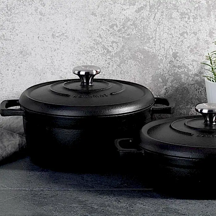 Turkish Cast iron Casta, which is resistant to high temperatures, adds color to kitchens with its black & red outer surfaces,